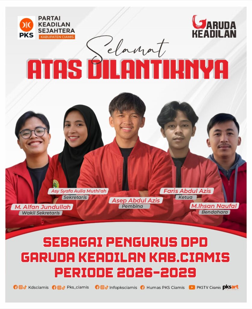 CIAMIS – Semangat baru menyelimuti barisan pemuda di Kabupaten Ciamis. Dewan Pengurus Daerah (DPD) PKS Kabupaten Ciamis secara resmi memberikan ucapan selamat atas dilantiknya jajaran pengurus DPD Garuda Keadilan Kabupaten Ciamis untuk masa bakti 2026-2029.